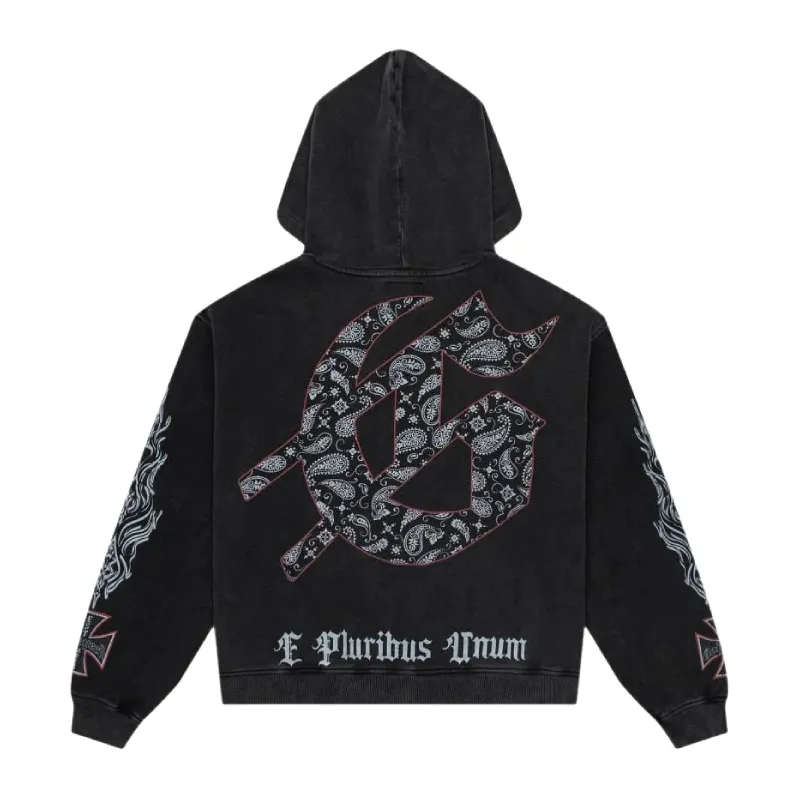 Our Black Godspeed Hollywood Infermo Hoodie grabs attention with striking details. A bold Liberty graphic takes the front spotlight. On the back, large GS lettering makes a strong statement. A subtle message near the lower back adds a cool, unexpected twist.