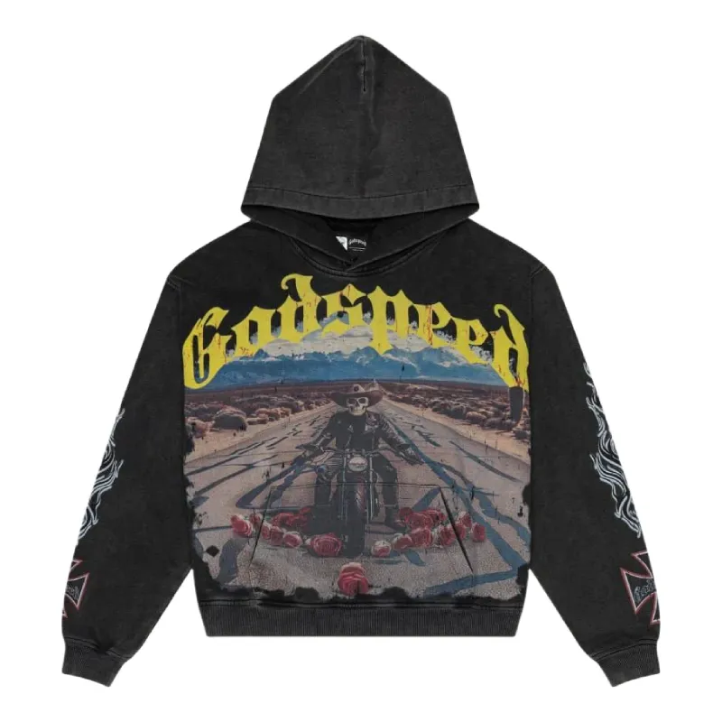 Hit the road with our Black Godspeed Long Lonely Road Pullover Hoodie. Crafted from 10oz mid-weight washed fabric, it offers lasting comfort and a soft feel. This limited edition piece features a striking digital art print that captures attention.