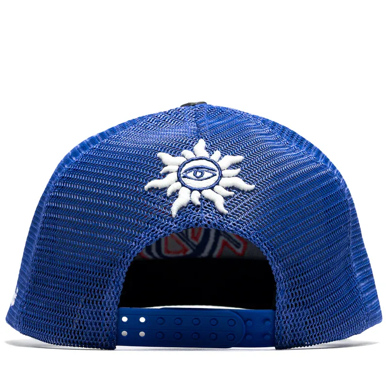Additional embroidered hits include a wordmark on the left side, a graphic on the back, and text detailing on the under visor—because details matter. Clean, confident, and made to stand out, this blue trucker hat is built for those who live fast and move purposefully.