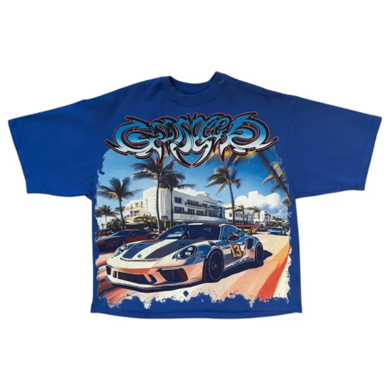 The Blue Godspeed Miami Exclusive GT T-Shirt brings bold energy to any outfit. Featuring a sharp Godspeed logo on the front and dynamic GT graphics on the back, it captures the spirit of speed and urban culture. The rich blue color makes the design pop without overwhelming.