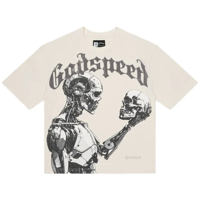 Step into the future of streetwear with our Bone/Black Godspeed Mankind vs AI 3 Tee. It is made from pure cotton fabric for all-day comfort. The standout feature is the bold “Mankind vs AI 3” graphic printed on the front, giving the shirt a strong visual edge.