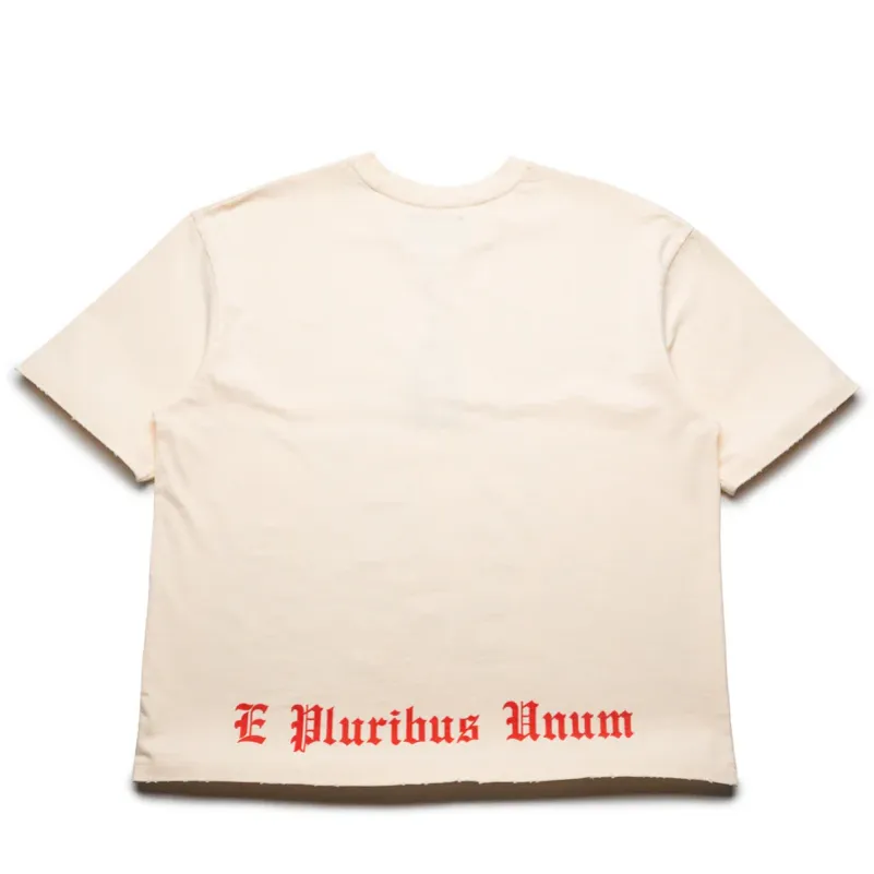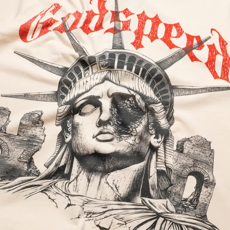 Our Bone Godspeed R.O.M.E Tee is built from 100% cotton with distressed detailing on the trims for a worn-in look that holds nothing back. The ribbed collar keeps its shape through heavy wear. Up front, the graphic hits hard—a ruined Statue of Liberty, bold and unsettling.