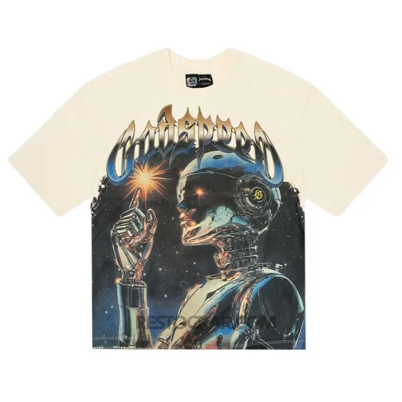 The Bone Godspeed Sputnik Moment T-Shirt delivers a fresh spin on graphic streetwear. This short-sleeve tee features a bold front print of a robot-inspired head, giving it a futuristic edge. The stylized “Godspeed” logo floats above the artwork, adding a signature touch.