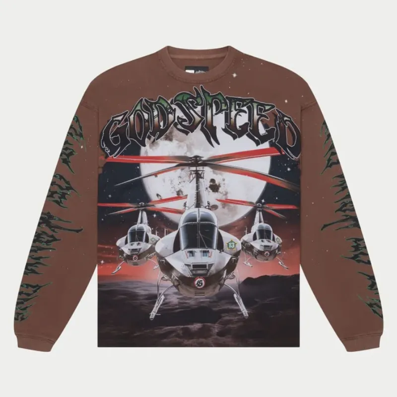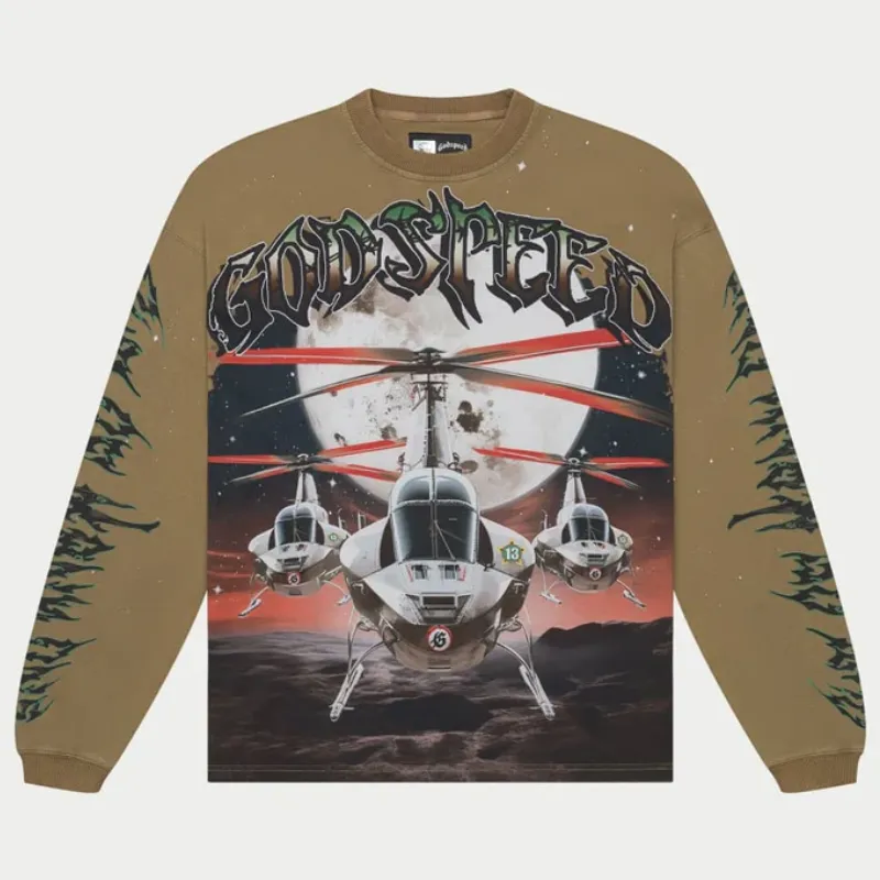 Our Godspeed Air Strike Long Sleeve T-shirt packs a bold punch with energy. In olive green and mocha, it brings severe heat with a front graphic of three helicopters soaring under a full moon and red sky. Above it, “Godspeed” rips across the chest in raw graffiti style. Tribal-inspired sleeve prints add an extra edge.