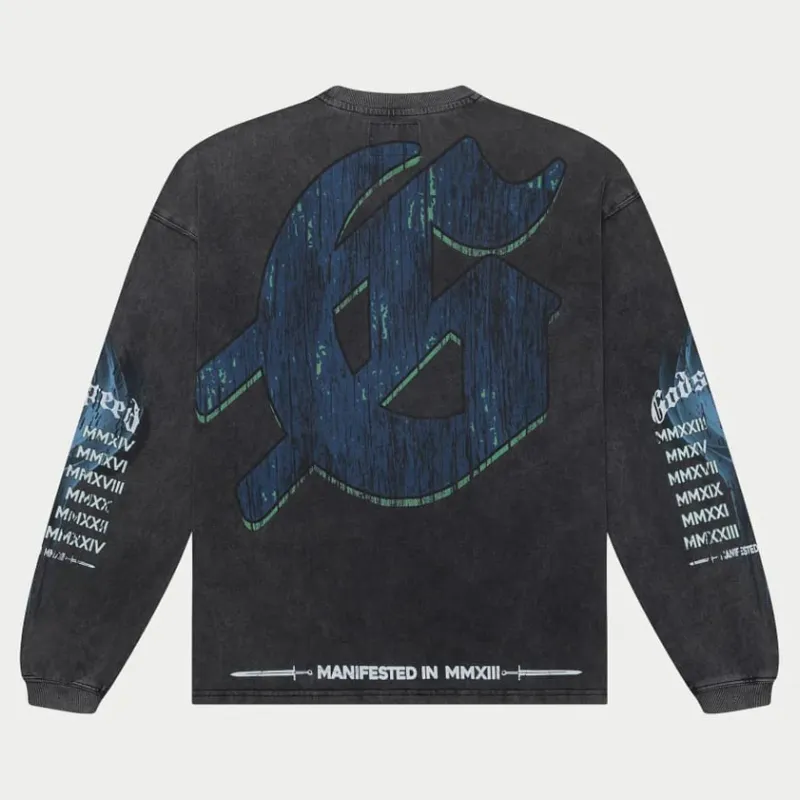 The washed grey finish gives it a vintage feel, while the ribbed crew neck keeps it classic. Designed with a relaxed, oversized fit, this piece is perfect for layering or wearing solo. This long-sleeved tee blends street style with statement art—built for those who move with purpose. Godspeed never settles.