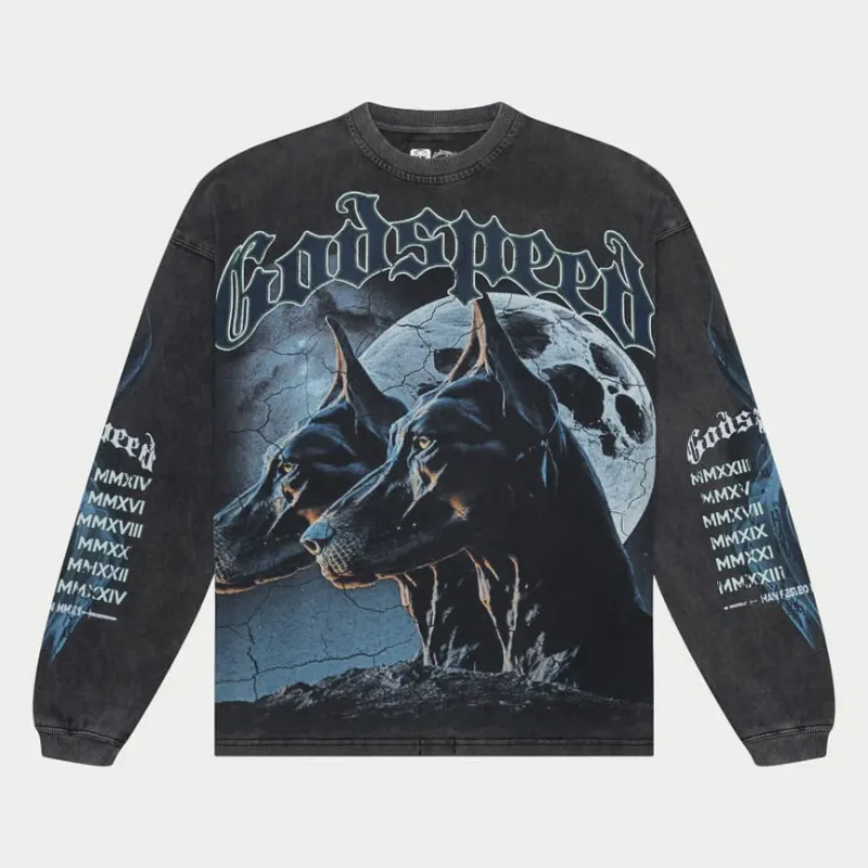 Our Grey Wash New Godspeed F.T.D LS T-Shirt is made to stand out. Featuring a bold front graphic with two Dobermans under a full moon and the “Godspeed” text above, this tee brings serious energy. Roman numerals run down both sleeves for added edge and detail.