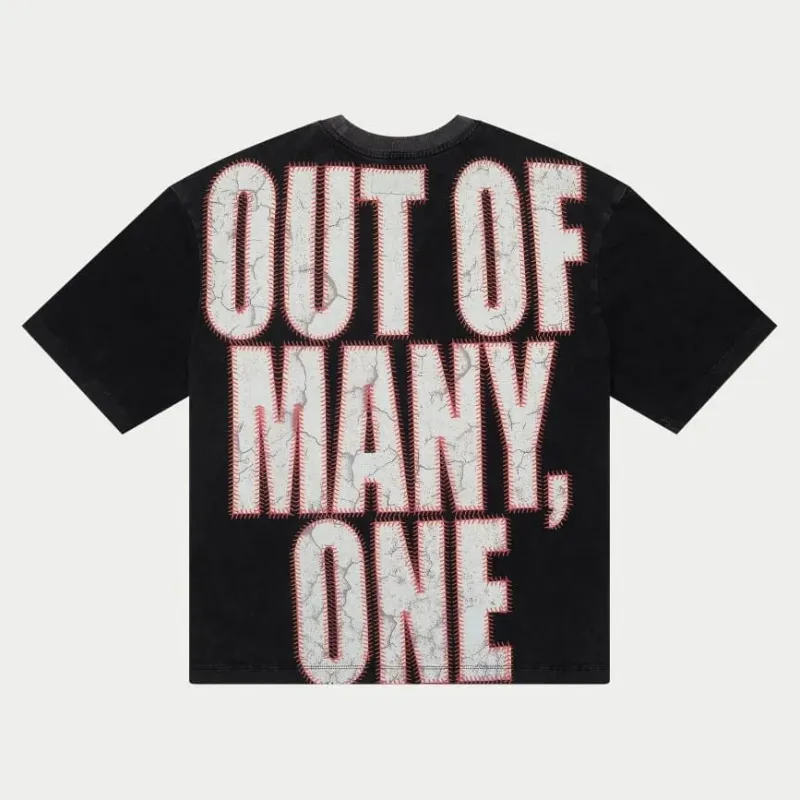 Our Grey Wash Strike I T-Shirt delivers a bold presence with a worn-in edge. Featuring a sharp Godspeed print across the front and a powerful back graphic reading “Out of many, one,” this tee merges visual energy with everyday ease.