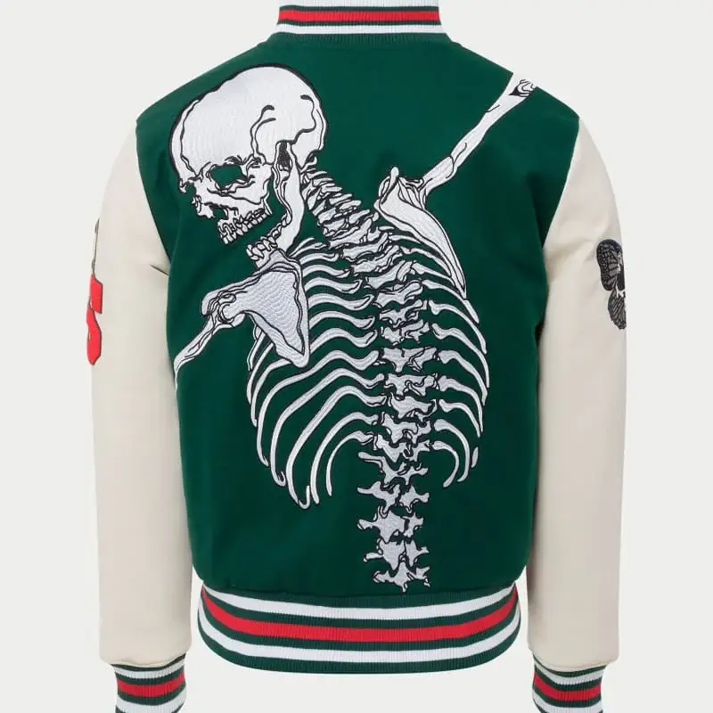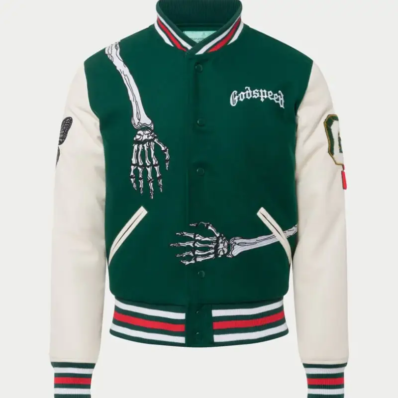 This Hunter Green Godspeed R.O.D Varsity Jacket brings bold attitude in every stitch. Built from heavy weight wool with premium leather sleeves—it’s all about presence. “Godspeed” hits bold on the chest—then the back goes off with a raw skeleton graphic that commands attention.