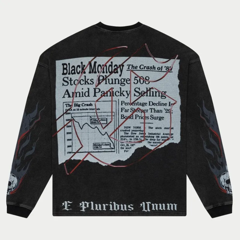 Our Men’s Black Wash Black Monday Thermal LS Sweatshirt brings bold energy to your cold-weather lineup. Designed in a unique black wash, this thermal long sleeve delivers comfort with attitude. The standout graphic print features a skeleton reading a newspaper—because even the dead keep up with the chaos.