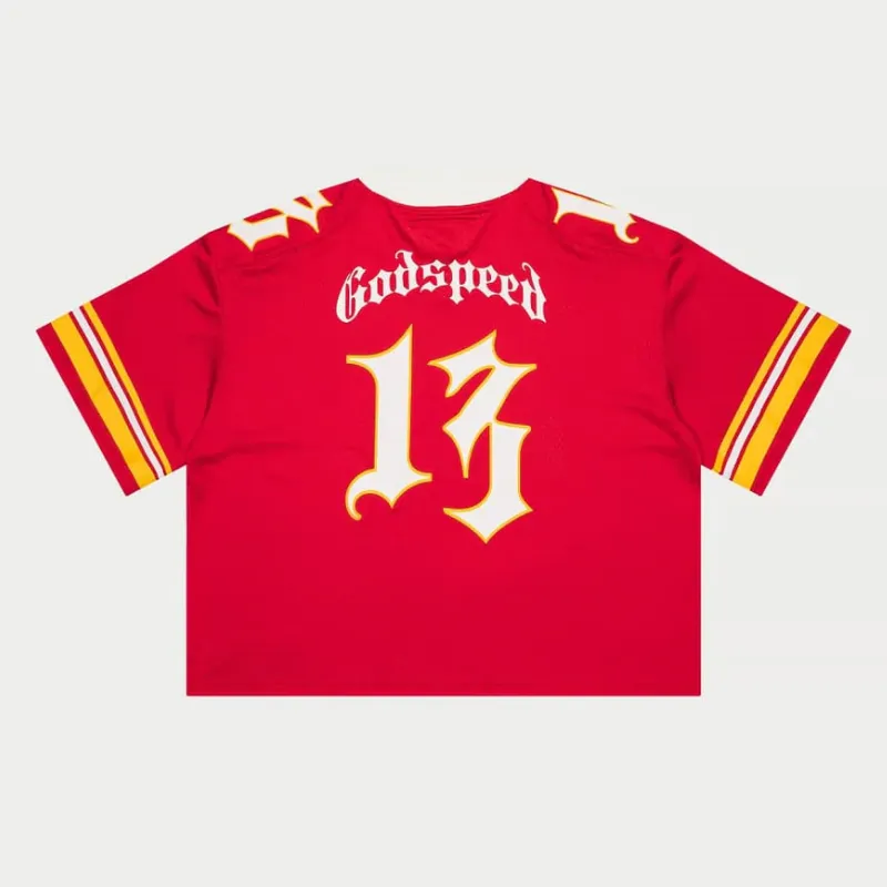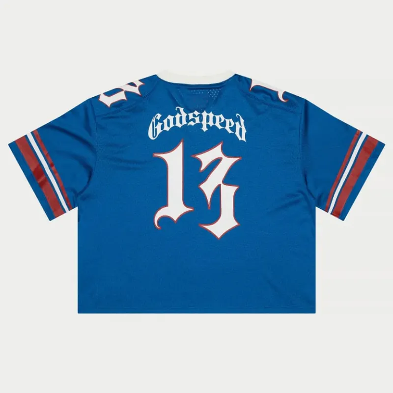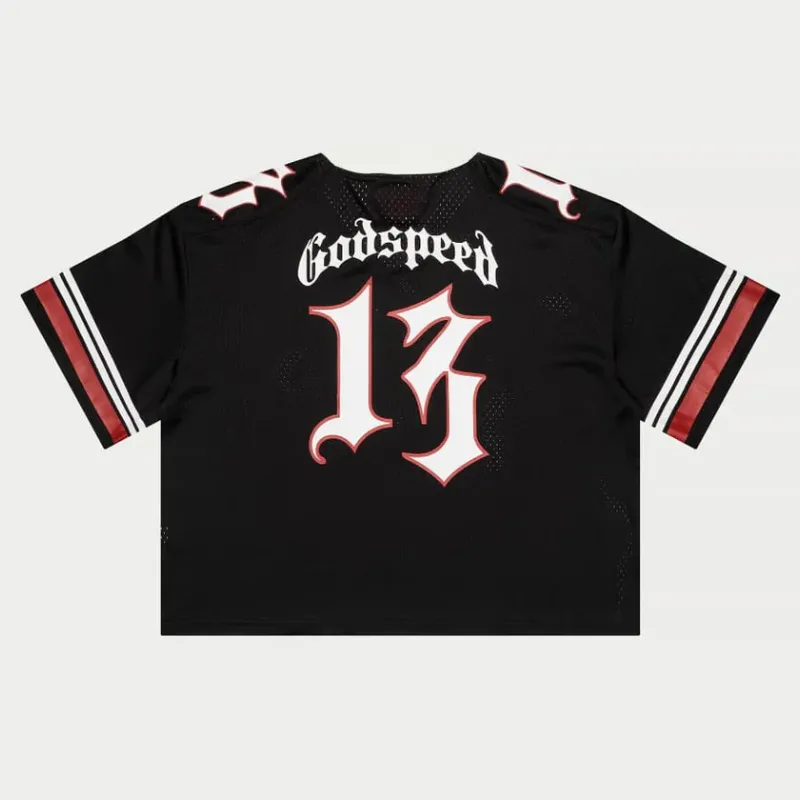 “Godspeed” text hits the shoulders with a fierce, stylized edge. Made from breathable, mesh-like fabric for all-day comfort, this jersey features a relaxed, oversized fit built for freedom and attitude. Finished with a signature red tag on the collar—this is streetwear with serious presence.