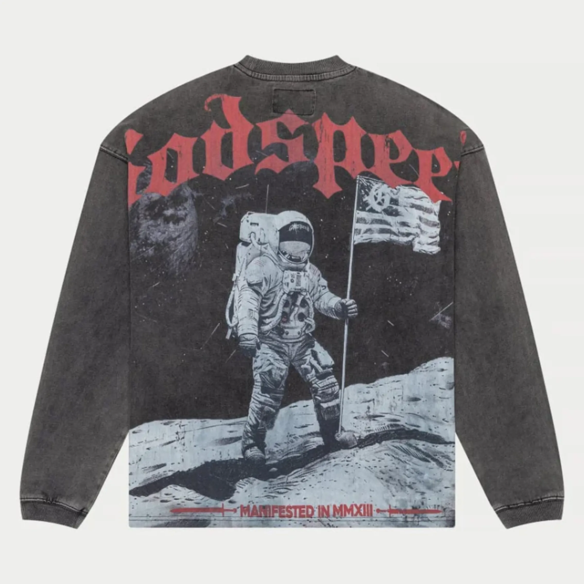 Our Men’s Grey Wash God Speed 1969 LS T-Shirt pays tribute to fearless exploration and timeless style. Designed in a standout grey wash, this long-sleeve tee features a bold graphic of an astronaut planting a flag on the moon—an icon of ambition and discovery. Above the print, “Godspeed” is proudly displayed in a striking Old English font, adding a classic edge to a modern fit.