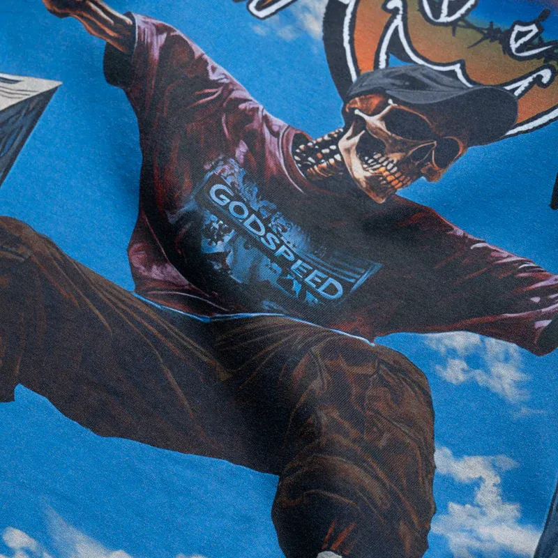 Our Men’s Royal Godspeed Ollie T-Shirt is built for bold moves and clean style. Made from soft, midweight cotton with a washed finish, this tee delivers comfort with a worn-in feel. Distressed detailing on the trims adds edge, while the ribbed collar keeps the fit sharp. Printed graphics on the left chest and back bring that signature Godspeed energy, and printed text on the lower back finishes it off with attitude.