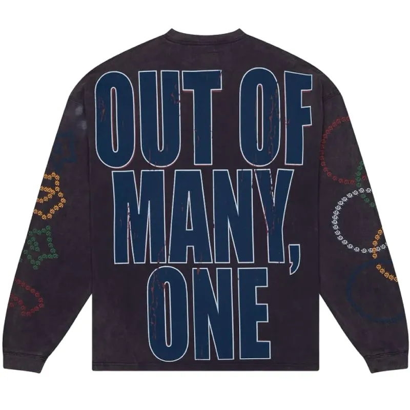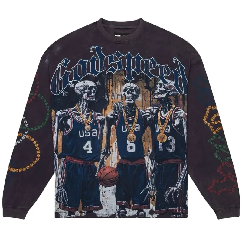 Our Vintage Navy Godspeed Dream Team 24 L/S Tee features 100% cotton for a soft and durable fit. The standout “Dream Team 24” graphic on the front adds a sporty touch, while “Out of many one” is printed on the back, giving the shirt a unique story.