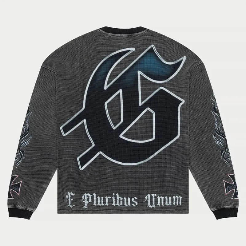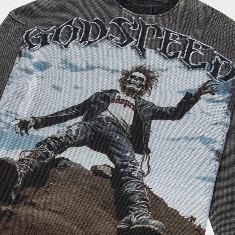 This Washed Grey Rocker Thermal Long Sleeve is designed for those who live fast and loud. It brings the energy with a front graphic that hits hard and bold prints down both sleeves. A heavy wash gives it that worn-in, road-tested feel from day one. “GODSPEED” arcs across the chest, backed by a rebel spirit and unapologetic attitude.