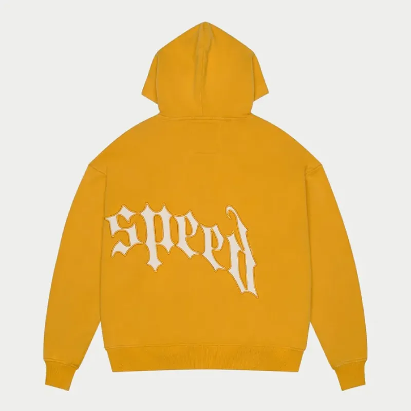 Make a bold move in the Yellow Godspeed OG Logo V2 Sweatsuit. This matching set features a full-zip hoodie with a striking “God” graphic across the chest. The relaxed-fit pants mirror the energy, finished with a vivid logo down the leg and snap-button hems.